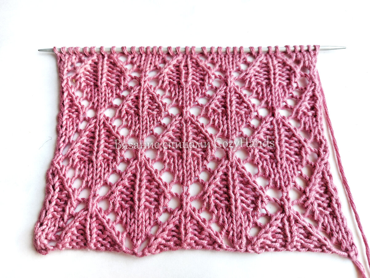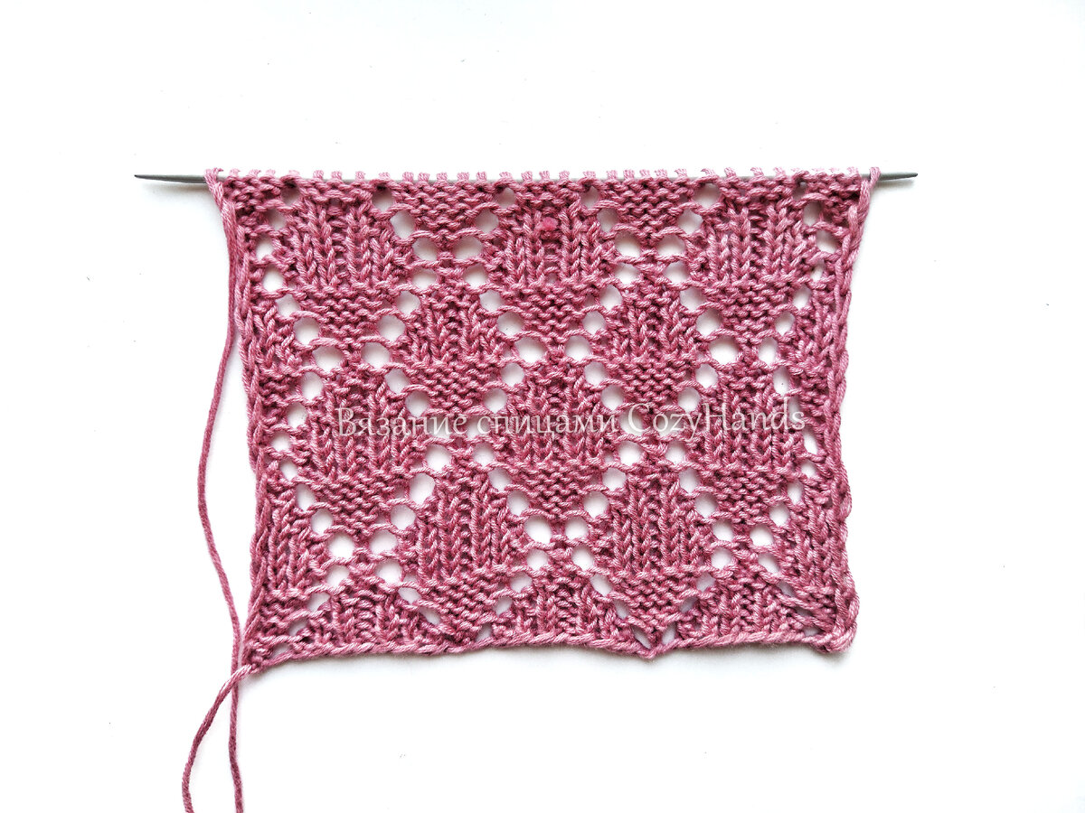 11 ряд: кром.п., * 1 лиц.п., 1 изн.п., 2 петли провязать вместе 1 лиц.п. с наклоном вправо, 1 накид, 3 лиц.п., 1 накид, 2 петли провязать вместе 1 лиц.п. с наклоном влево, 1 изн.п., * 1 лиц.п., кром.п.