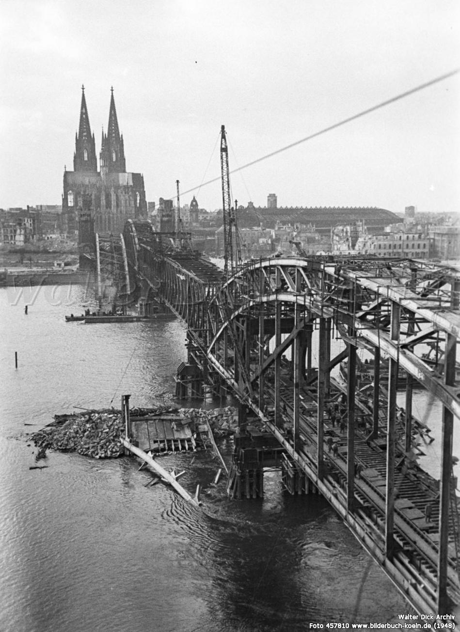 В 1945 году, в конце Второй мировой войны, отступающая немецкая армия взорвала все мосты через Рейн, включая мост Гогенцоллернов. Всего через три года мост был частично отремонтирован, а в 1959 году Гогенцоллернбрюке был полностью реконструирован. Внушительные входы на мост были снесены в 1958 году и не были заменены.