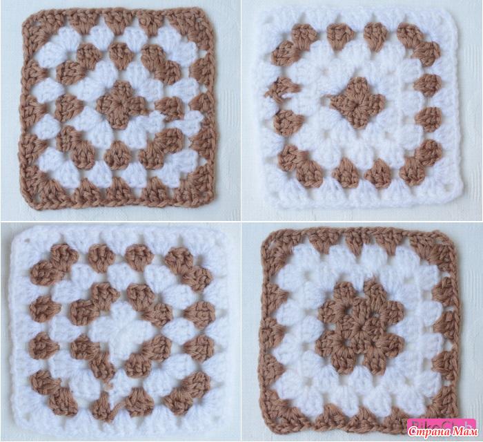 Ниже на фото 4 изображены «Granny Square», выполненные чередованием всего 2-х цветов.
