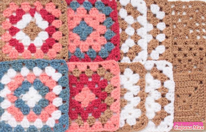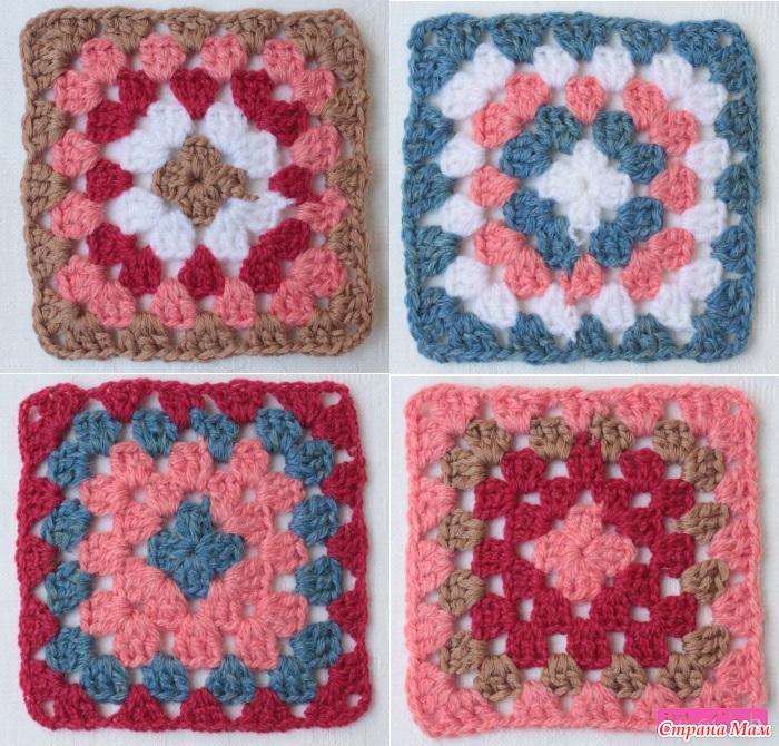 От себя добавлю, что на просторах интернета я встречала и «Бабушкин треугольник», а также наиболее сложные «Бабушкины квадраты» со всевозможными цветами в центре или связанные из центра по спирали.