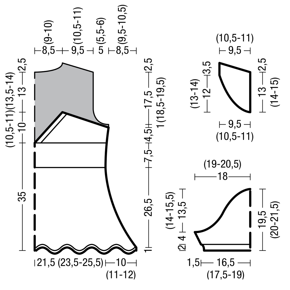 Через 17,5 (18,5-19,5) cм = 60 (64-68) р. от пройм закрыть с обеих сторон для плечевых скосов 1 раз по 4 (6-4) п. и в каждом 2-м р. 4 раза по 5 (5-6) п.