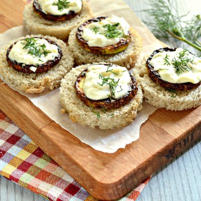 Для приготовления аппетитных бутербродов сначала уделим время кабачкам. Их нужно будет нарезать на кольца, приправить специями и обжарить в растительном масле. Затем уложим кабачковые кольца на хлебные ломтики, смажем чесночным соусом и присыплем зеленью. Получается сытная закуска, к тому же – бюджетная!