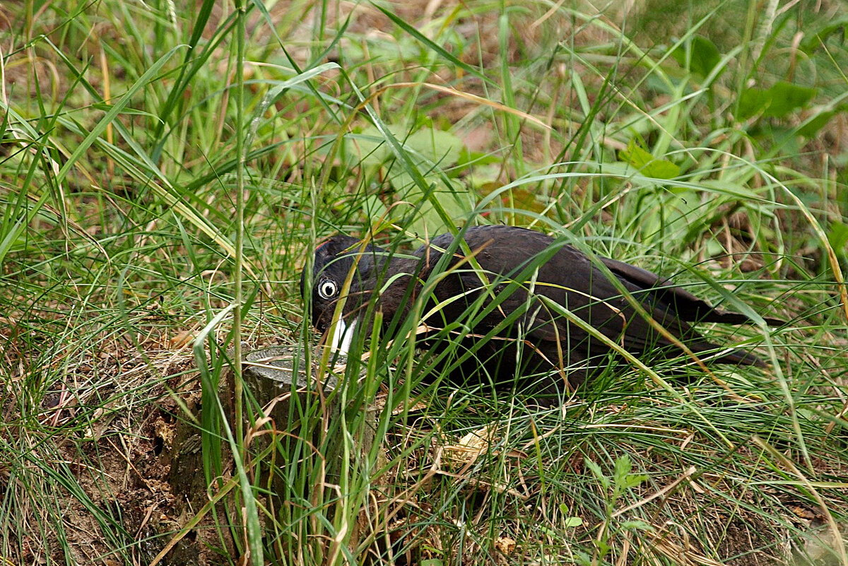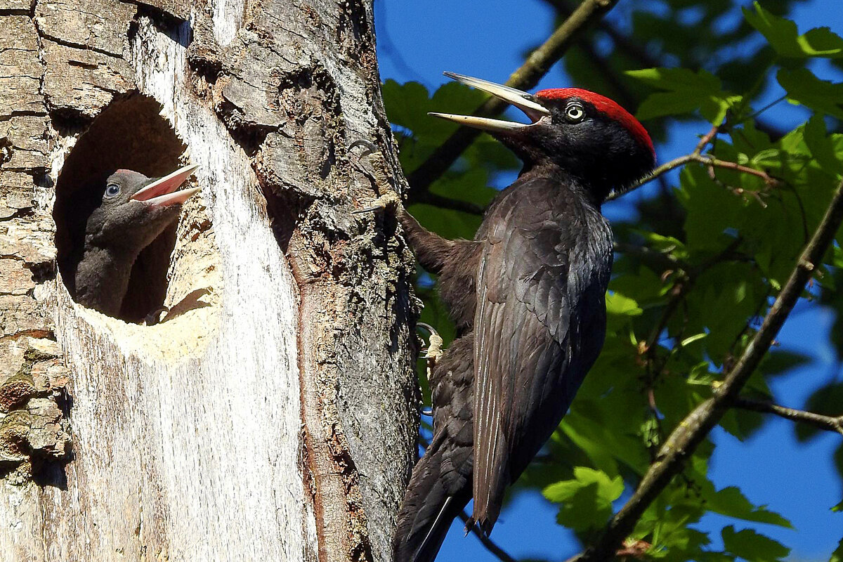 Чёрный дятел никогда не боялся человека. Но увидеть пернатого в дикой природе сложно — маскхалат весьма качественно сделан. Выдать присутствие желны может место его трапезы. Обычно от дерева не остаётся ровным счётом ничего. Ученый Карл Фогт задокументировал интересный случай — желна заняла его покои! Птица услышала в недрах древесного дома насекомых и буквально выселила людей из строения. Упорства дятлам хватает! Увлёкшись, они не замечают супостатов.