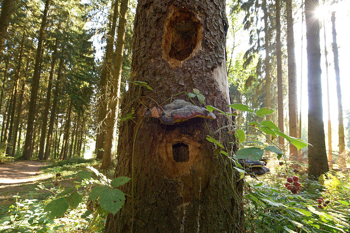 Громадные сквозные дыры в стволах сосен — работа чёрного дятла. Однако орнитологи провели исследование, в ходе которого выяснили невероятное. Желна никогда не трогает здоровые растения. Только если внутри ствол прогнил из-за расточительной деятельности точильщиков, чёрный дятел обратит на него внимание. А если уж приметил, то на стволе более не останется ни одного насекомого. Отверстия и ниши хвойные деревья залечат смолой. Спаситель он, а не крушитель!