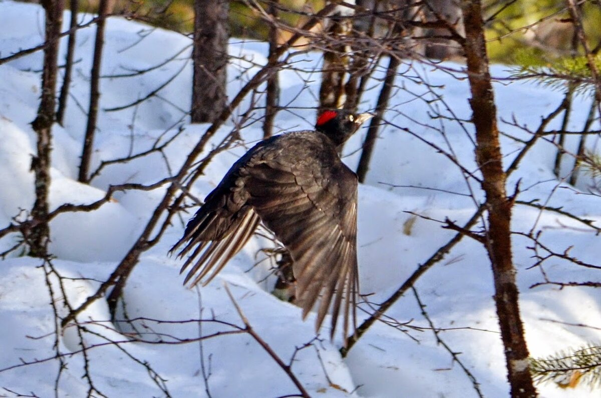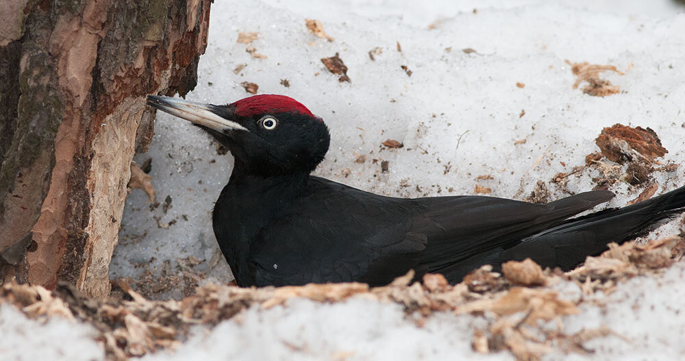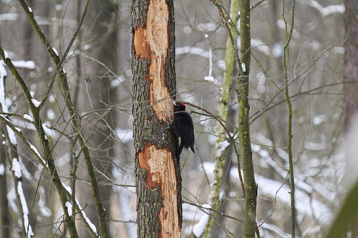 Желна, так часто называют черного дятла, величиной с ворону. И он самый крупный из наших дятлов, но, ко всему прочему, он ещё и самый осторожный. Весной и летом, во время гнездовых забот, обнаружить его, вообще, большая удача. А всё потому, что найти кормящегося чёрного дятла легче всего, ориентируясь на громкий, легко запоминающийся голос или гораздо более сильные, чем у других дятлов, звуки от ударов клювом, когда желна долбит деревья. Летом, когда он насиживает яйца и кормит птенцов, дятел бывает молчалив, а, едва заметив человека, сразу улетает.Живёт желна в наших лесах круглый год, но, имея большой участок, в разное время года держится в разных его местах