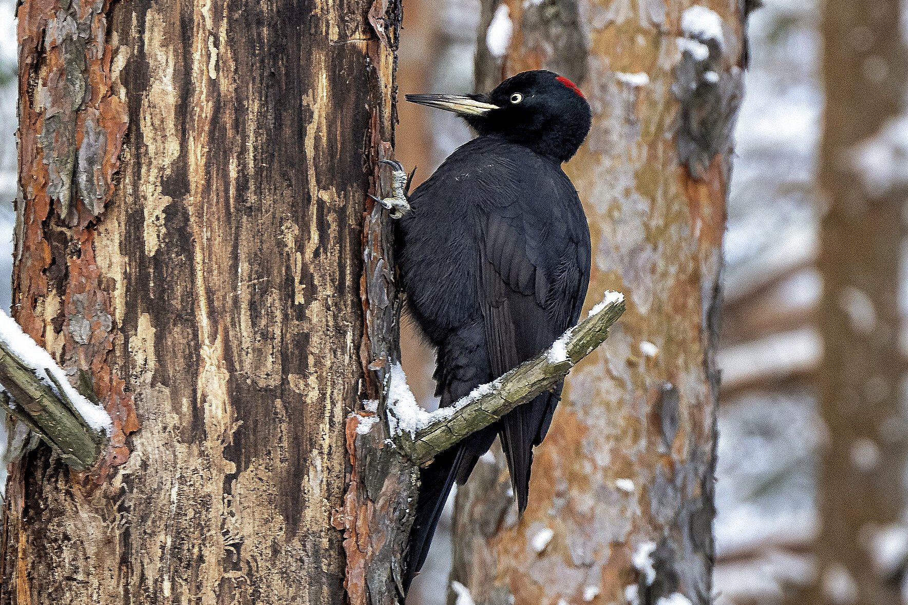 Зимой чёрный дятел большую часть дня проводит в поймах лесных ручьёв или в черноольшанниках. В таких сырых местах много больных и сухих деревьев, которые изобилуют личинками жуков и уснувшими муравьями. По неведенью можно подумать, что основной пищей этого крупного дятла являются короеды, жуки и их личинки. На самом деле большая часть его рациона – муравьи разных видов. Если летом это в основном рыжие муравьи, ради которых он разрывает высокие муравейники, то зимой больше всего им поедаются муравьи-древоточцы.