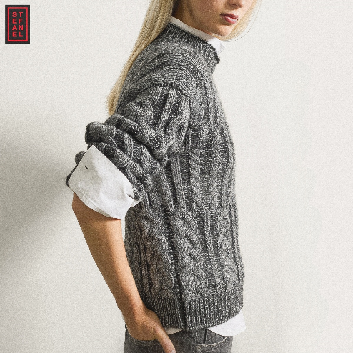 Эту модель можно назвать классикой с характером. Крупные косы чередуются с узкими жгутами и рельефными дорожками — простая идея, но эффект интересный.
