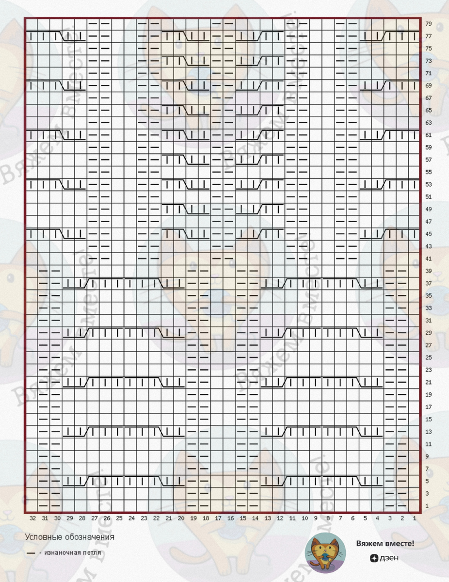 Раппорт узора — 32 петли и 80 рядов. Пустая клетка = лицевая петля.