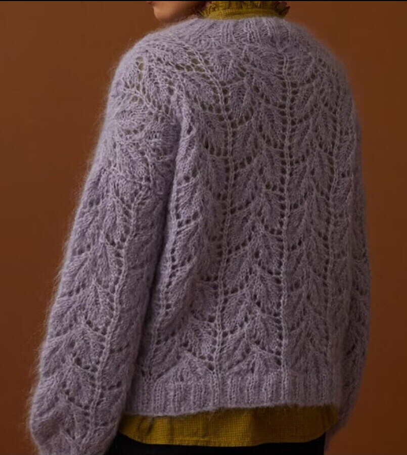 Этот кардиган в свободном стиле подсмотрен в коллекции Debbie Bliss. Цвет пряжи очень приятный. Состав у данной нити 78% мохер, 13% шерсть, 9 % полиамид. Толщина нити: 100м/50гр. Спицы № 6 мм.