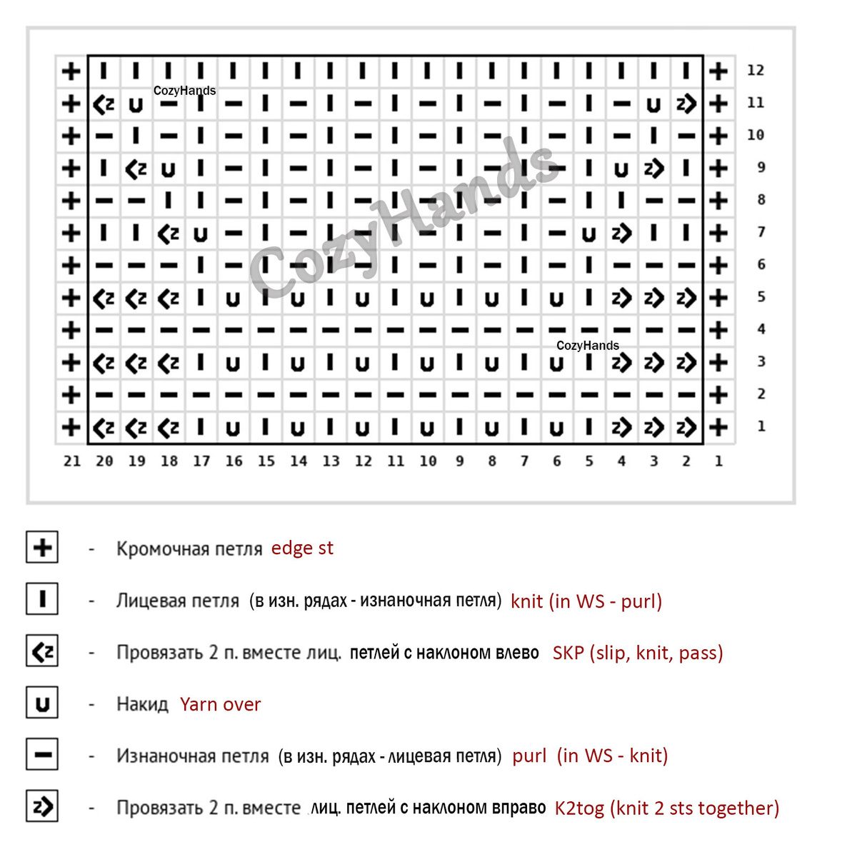 Раппорт узора состоит из 19 петель и 12 рядов.