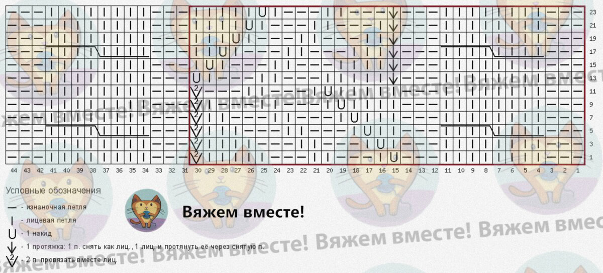 Раппорт узора равен 30 петлям в ширину и 24 рядам в высоту, на схеме он выделен красной рамкой.