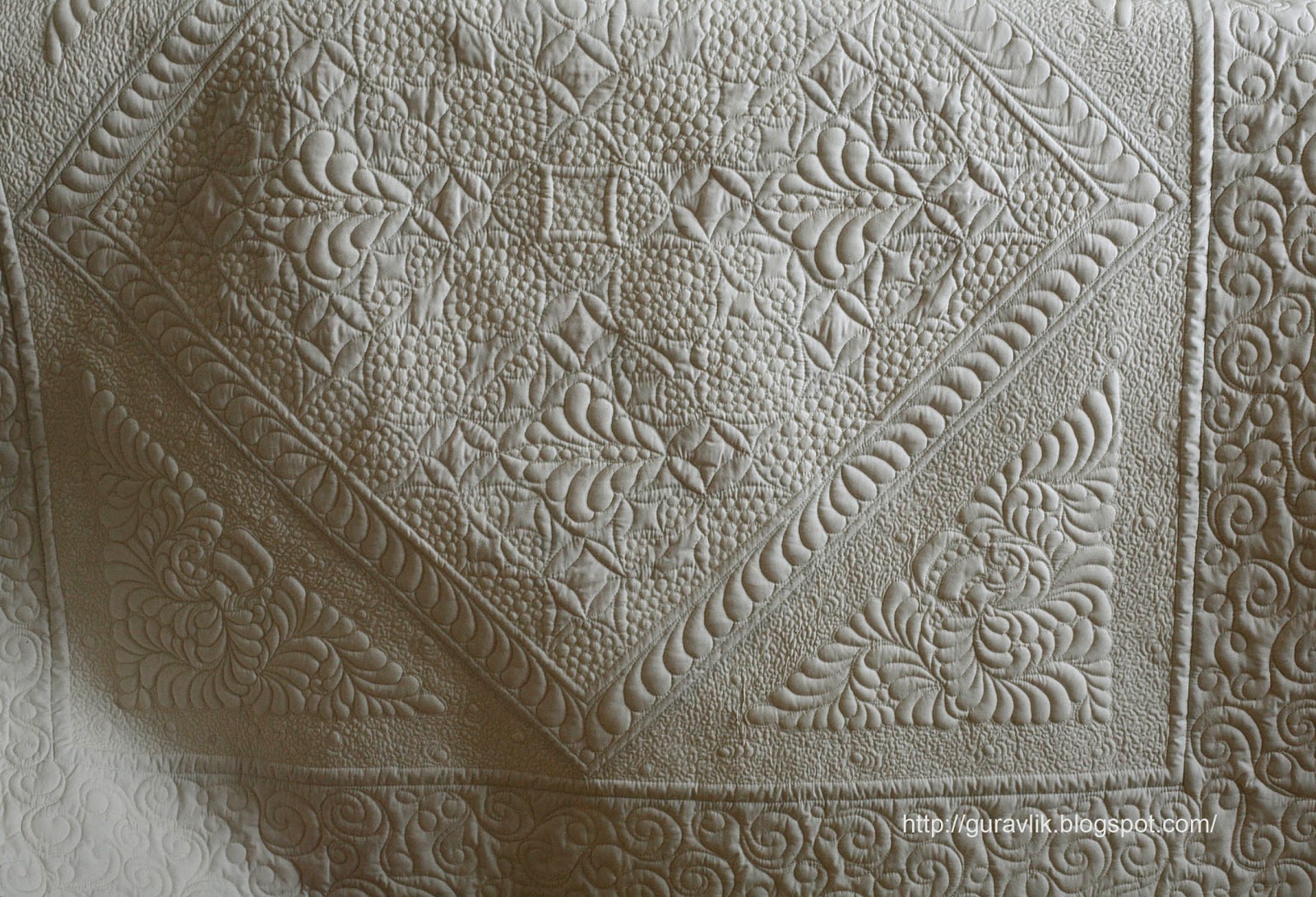 9. Делаем трапунто. Добавляем синтепон по окантовке блоков в 1 слой, я использовала 100ку.