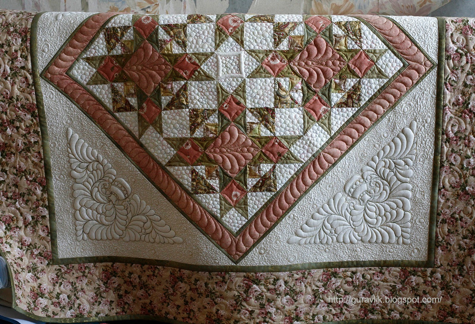 Я остановилась на темном оливковом меланже, чтобы достаточное пространство белого уравновесить с центральной лоскутной частью.