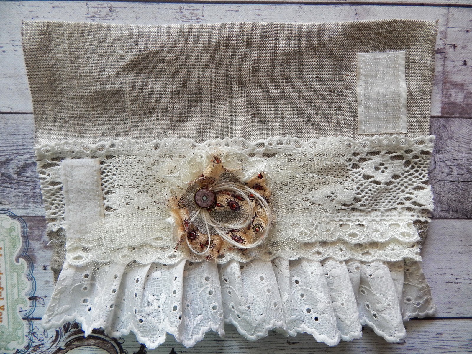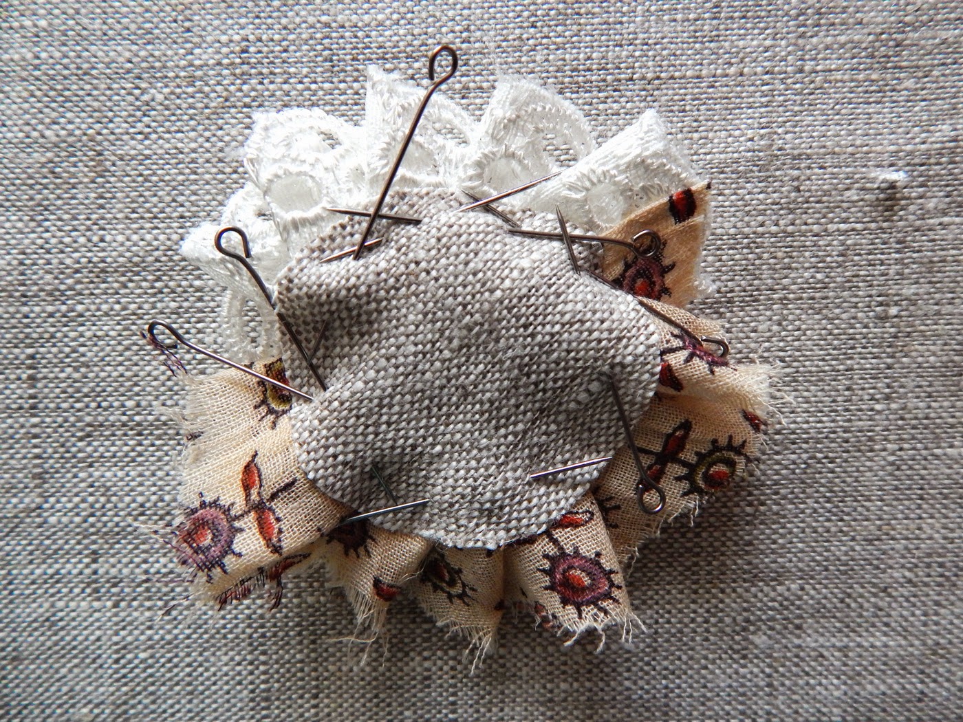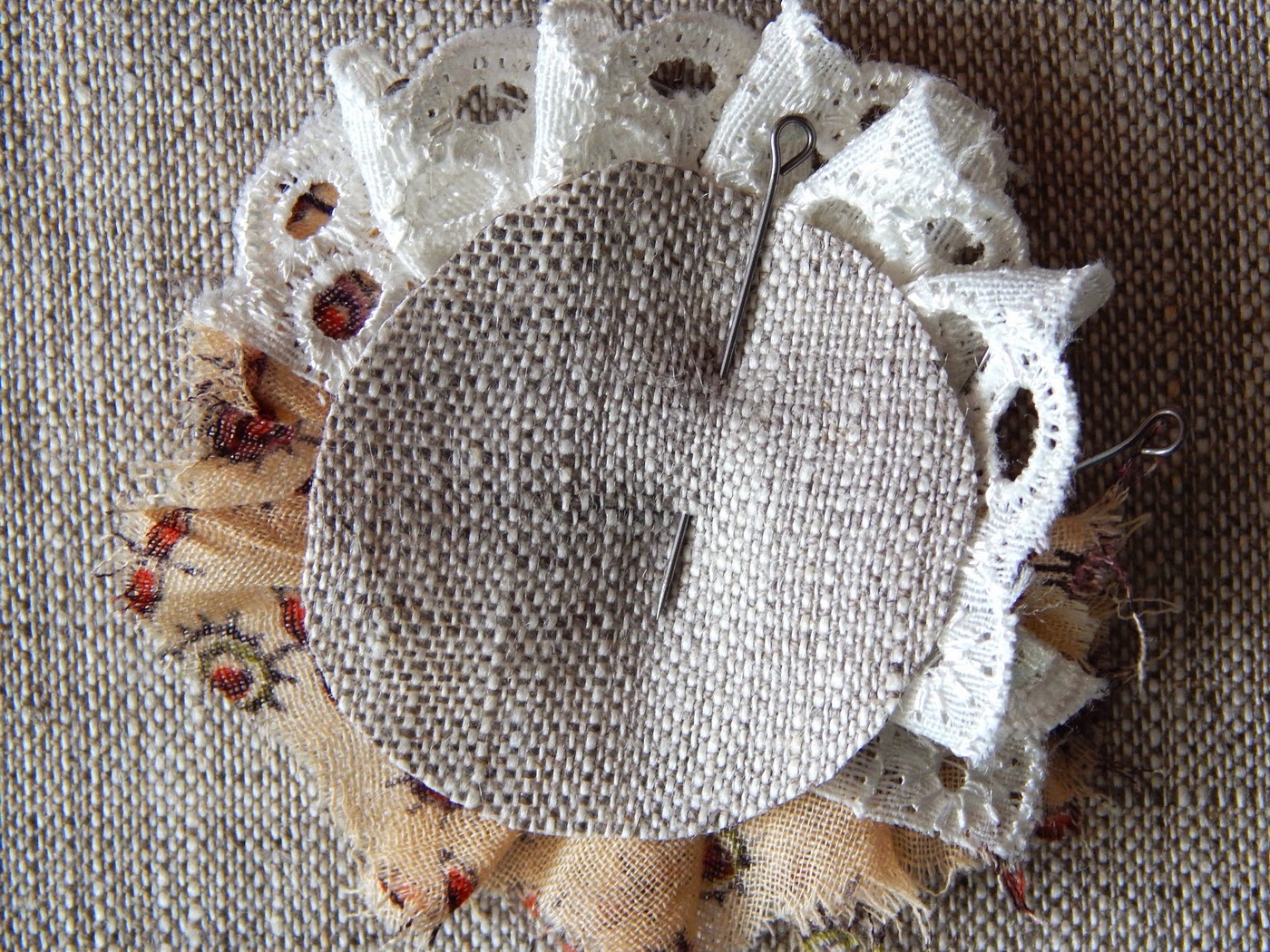 11. Берем наш кружочек, и булавочками наметываем ленточку и кружево. Здесь уже видно., что я взяла другое. Первоначальное смотрелось грубовато.