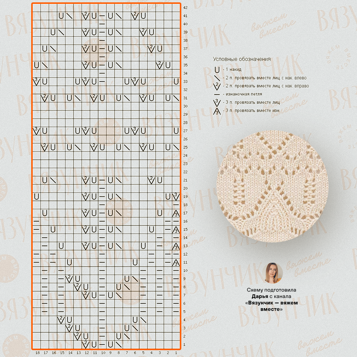 Во-вторых, обратите внимание на схему, а именно на петли с 11 по 19 ряд. Там провязываются убавления по три петли. Чтобы узор получился, в крайних раппортах вяжите не три вместе, а 2 петли вместе в начале вязания и две петли вместе в конце, т.е. по две петли вместе в первом раппорте справа и две петли вместе в последнем раппорте слева (19 петлей).
