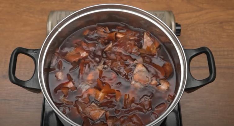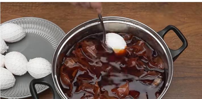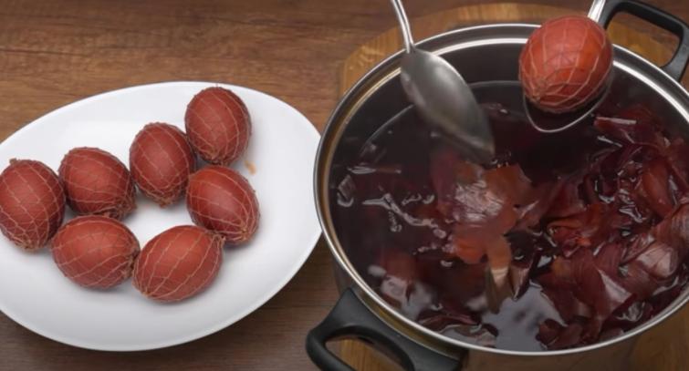 Подготовленные яйца необходимо опустить в кастрюлю с луковым раствором.
