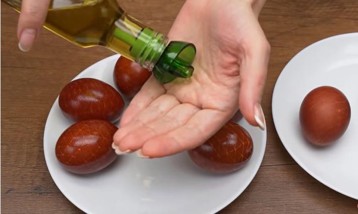 После остывания бинт необходимо разрезать. Для более красивого и праздничного вида яйца смазывают растительным маслом.