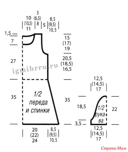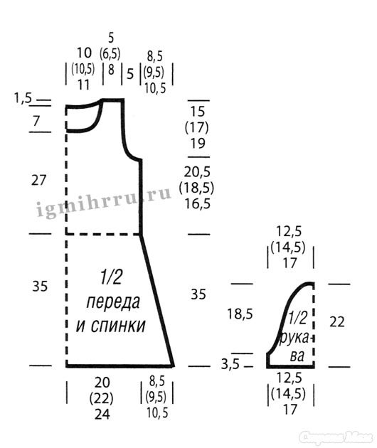 Перед: вязать как спинку, но для более глубокого выреза горловины закрыть через 27 см = 76 р. от смены узора средние 22 (25) 26 п. и с внутреннего края 1 x 3, 2 х 2 и 3 х 1 п.