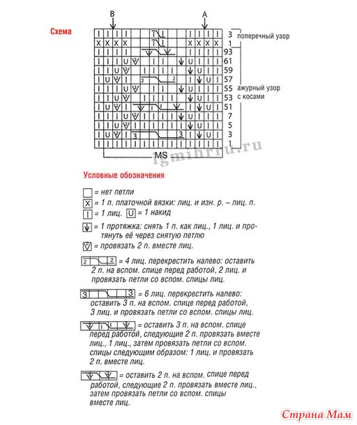 Поперечный узор: число петель кратно 9 + 1 + 2 кром. Вязать также по схеме, на которой приведены только лиц. р., в изн. р. все петли вязать изн. или как указано. Начинать с 1 кром., повторять раппорт, заканчивать петлёй после раппорта и 1 кром. Повторять с 1-го по 4-й р.
