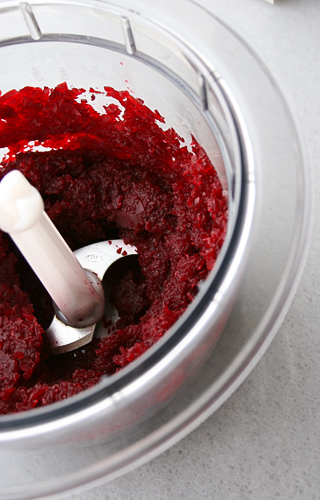 *Свекольное пюре сделать из приготовленной вашим любимым образом свеклы (запеченной, сваренной или в микроволновке, как я). Чтобы приготовить в микроволновке, нужно очистить 2-3 небольшие свеклы, порезать их крупными кусками, сложить в миску для микро, влить в эту самую миску пол стакана воды, накрыть крышкой и готовить на полной мощности 15 минут. Остудить и измельчить в блендере (без воды!).