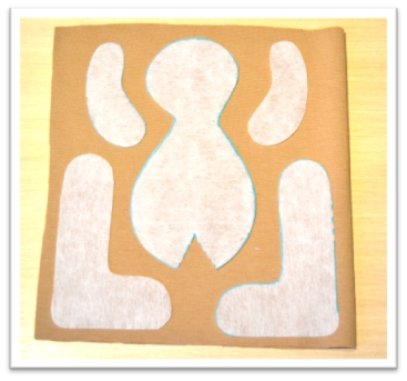 1) Ткань для тела (плюш) складываем лицом к лицу, внимательно следим что бы направление ворса было сверху вниз (от макушечки до пяточек) Прикалываем булавками выкройку (тело, 2 ножки, 2 ручки, как на фото).