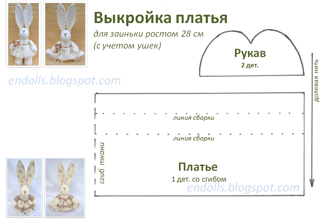 4) Одеваем платье на заиньку, подворачивая ткань по линии сборки. Стягиваем нитку, равномерно распределяя складочки платья по шее и грудке. На 1,5-2 см ниже горловины горизонтально снова присобираем платье на нитку, фиксируем. По этой линии пришиваем платьице к телу, обвязываем ленточкой и завязываем по центру переда бантик, украшаем красивой деревянной пуговкой или братсом.
