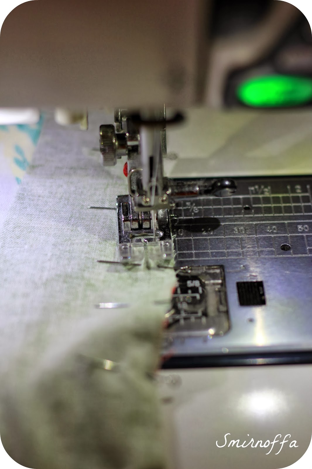 А простегиваю я вообще очень просто. Вдоль линий швов с той стороны, куда припуски заглажены. На обычном ходу машины. Опять же любимая лапка G позволяет контролировать расстояние от строчки до шва.