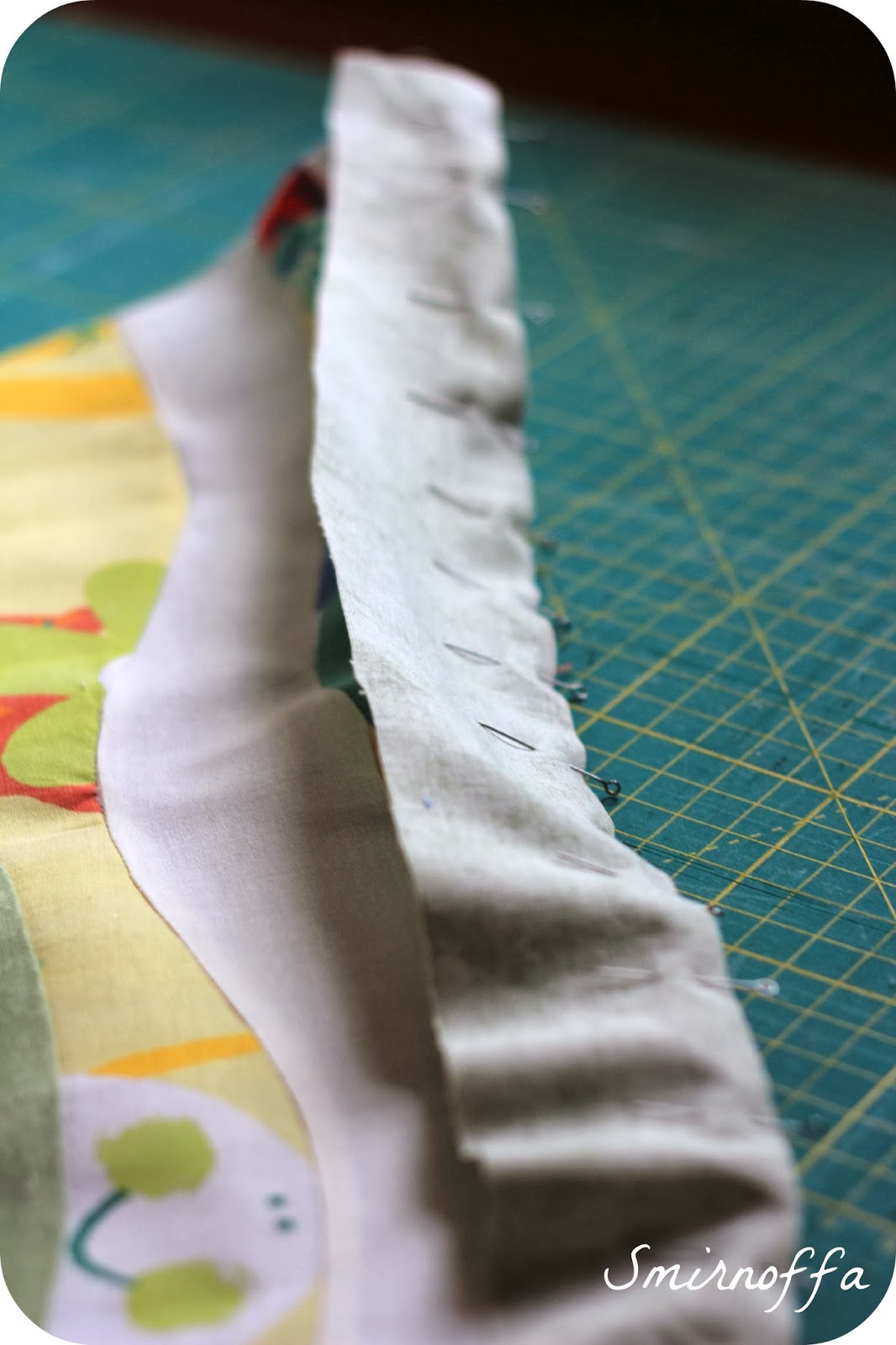 ...Приложили кусочек ткани, роликовым ножом нарисовали линию, верхние обрезки выбросили, поставили метки, скололи, стачали, разгладили.
