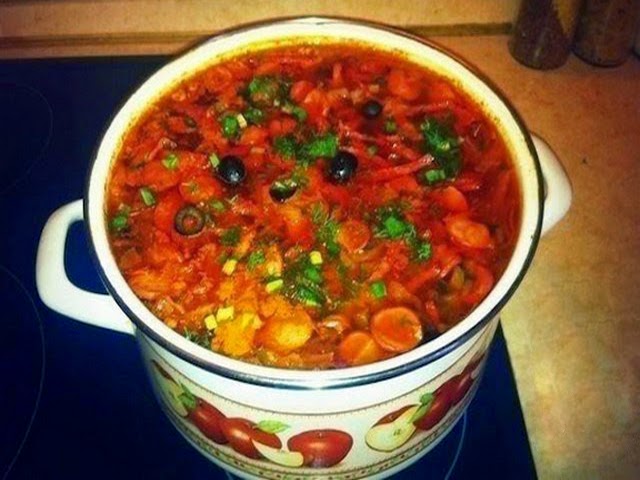 Варить мин 10 и в конце добавить обжарку из сосисок с сервелатом. Ну и мяско нарезаное.