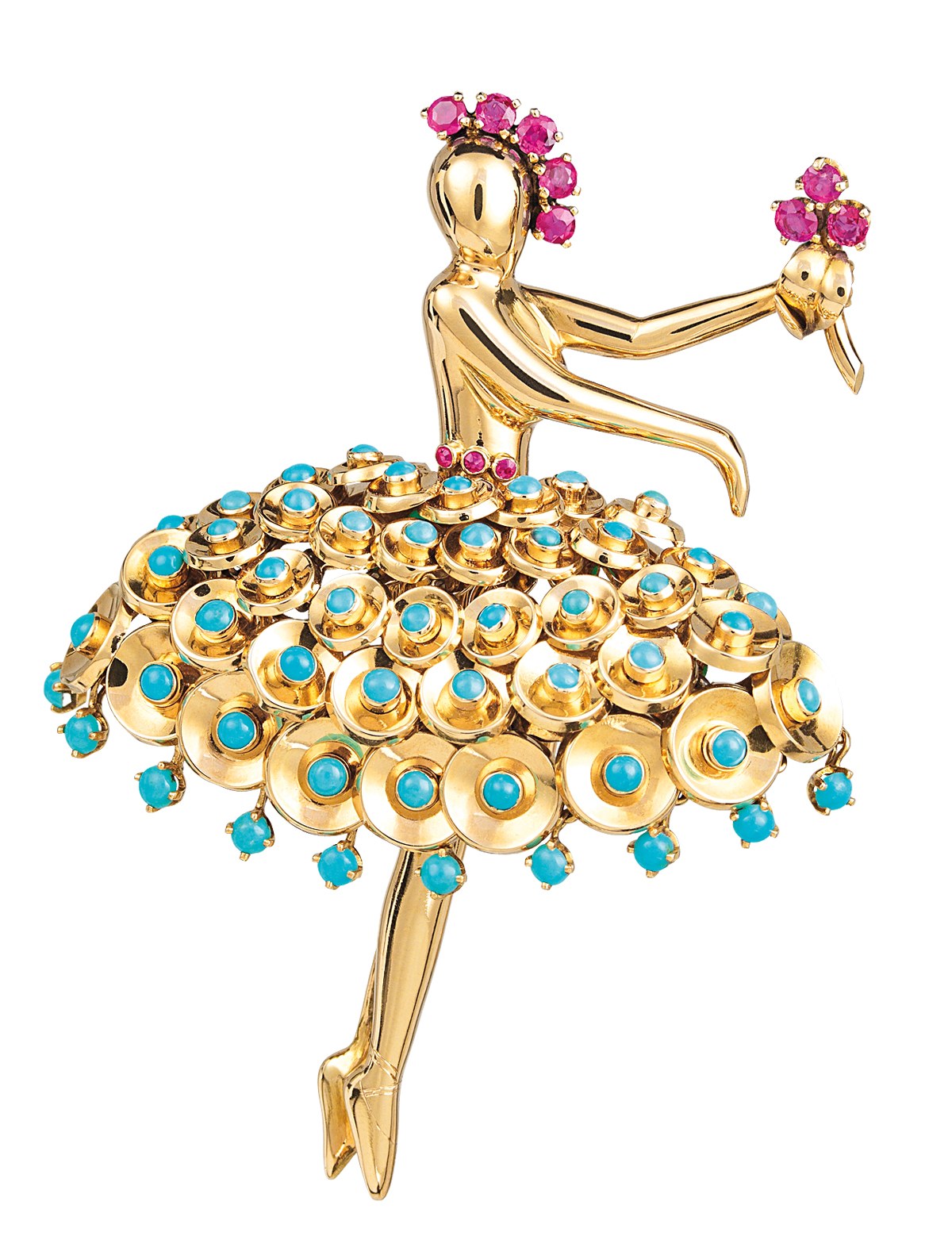 Брошь-балерина, 1952 год. Платина, желтое золото, бирюза, рубины, бриллиант, коллекция Van Cleef & Arpels