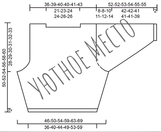 На высоте 3 см прибавить по 1п с двух сторон - см. Описание узоров! Делать прибавки каждые 2½-2½-3-3-3-3 см всего 7 раз с двух сторон = 66-72-78-84-90-98п. На высоте 22-23-24-25-26-27 см закрыть петли с двух сторон делали для пройм в начале ряда: закрыть по 3п 1 раз, по 2п 1-2-2-3-4-4 раз и по 1п 3-2-4-5-5-8 раза = 50-54-56-56-58-60п. Продолжить работу до высоты 48-50-52-54-56-58 см. В следующем ряду для выреза горловины закрыть центральные 30-32-34-34-36-36п и закончить оба плеча раздельно. Вязать 10-11-11-11-11-12п плеча до высоты 50-52-54-56-58-60 см. Свободно закрыть петли. Связать второе плечо аналогично.