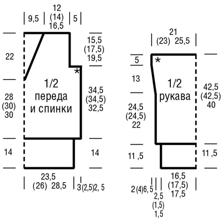 Для скосов рукавов через 24,5 см = 44 ряда (24,5 см = 44 ряда) 22 см = 40 рядов от планки с обеих сторон прибавить согласно рисунку 1 х 1 п., затем в каждом 10-м ряду 2 х 1 п. (в 6-м ряду 1 х 1 п. и в каждом 4-м ряду 4 х 1 п.) в каждом 4-м ряду 2 х 1 п. и в каждом 2-м ряду 7 х 1 п. = 67 (73) 81 п.