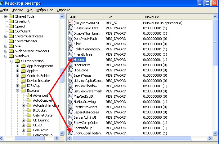 Hidden, ShowSuperHidden: значение 0 - не показывать.1 - показывать.