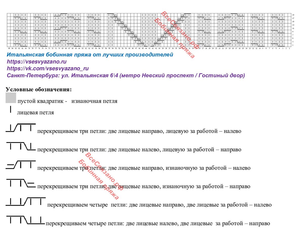 На схеме нарисован один раппорт рельефного узора в высоту (68 рядов), а в ширину он 16 петель (выделен внизу).