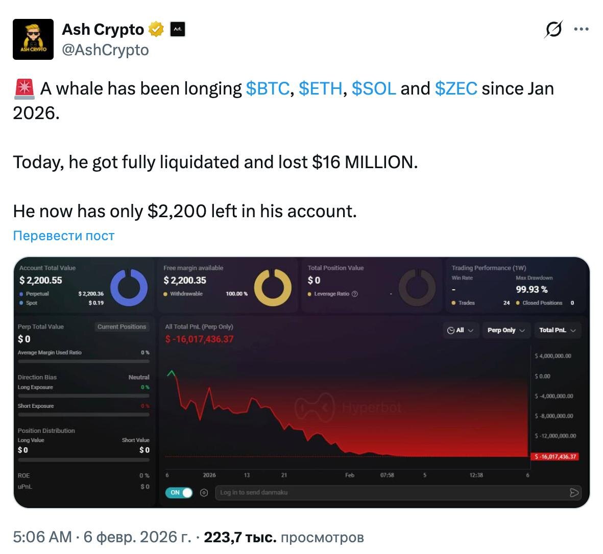 Один крупный игрок держал лонги по $BTC, $ETH, $SOL и $ZEC с января 2026 года. Сегодня его полностью ликвидировали, и он потерял $16 миллионов.