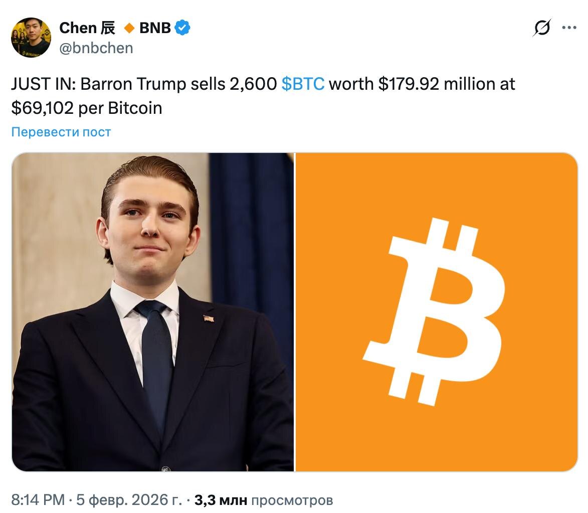 "Сын Трампа Баррон продал 2600 биткоинов $BTC на сумму $179,92 млн по цене $69 102 за биткоин" — твиттерские
