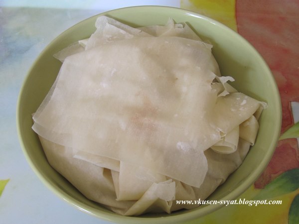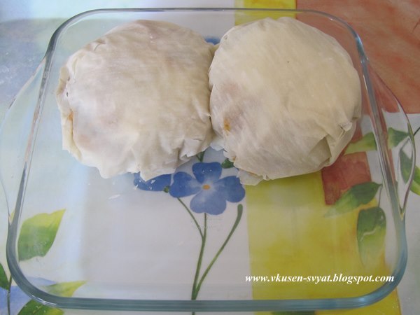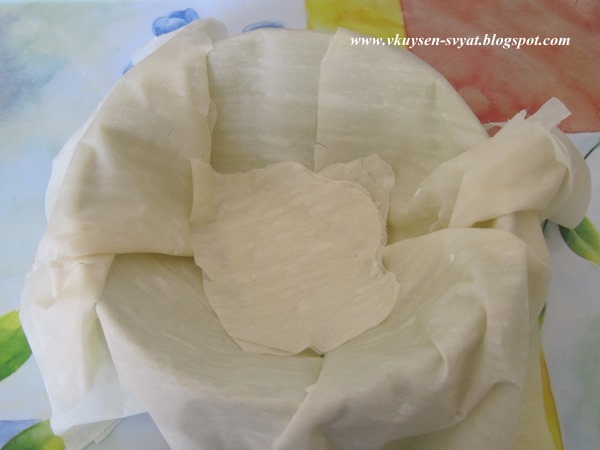За всяка порция покриваме купичката с две кори за баница, като оставяме краищата им по-дълги от едната страна..