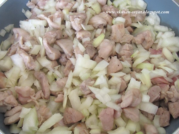 Оставяме хапките да се запържат до побеляване и добавяме ситно нарязания кромид лук.