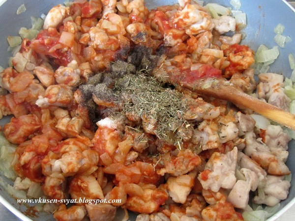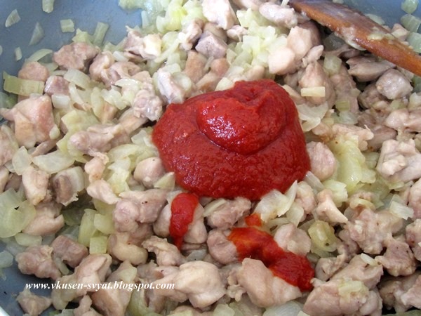 След като сместа от пилешко и лук се задуши, добавяме доматеното пюре и разбъркваме.