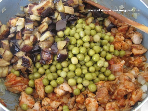 Накрая добавяме запечените патладжани и граха, разбъркваме и похлупваме с капак цялото ястие да се задуши още няколко минути.