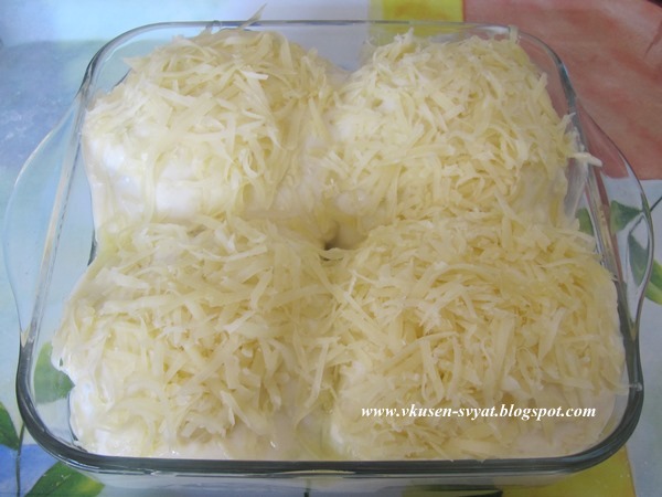 Всички порции покриваме с бешамеловия сос с топено сирене и поръсваме с настърган кашкавал.
