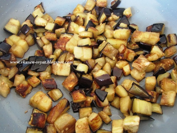 В тиган сгорещяваме 2 с.л. олио, сипваме патладжаните и оставяме да се запекат до златисто.
