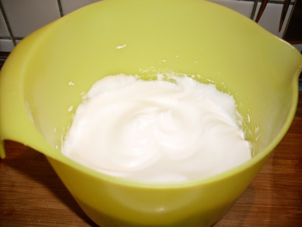 Пет минути, преди да бъде готов сладкиша, разбих в суха купа белтъците до сняг, като към края на разбиването много бавно добавих 3-те супени лъжици захар.