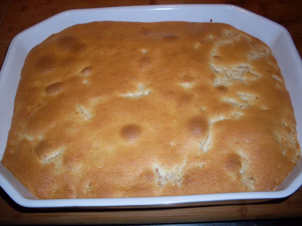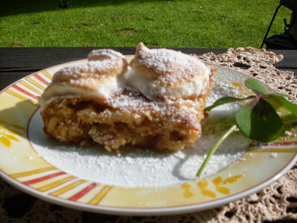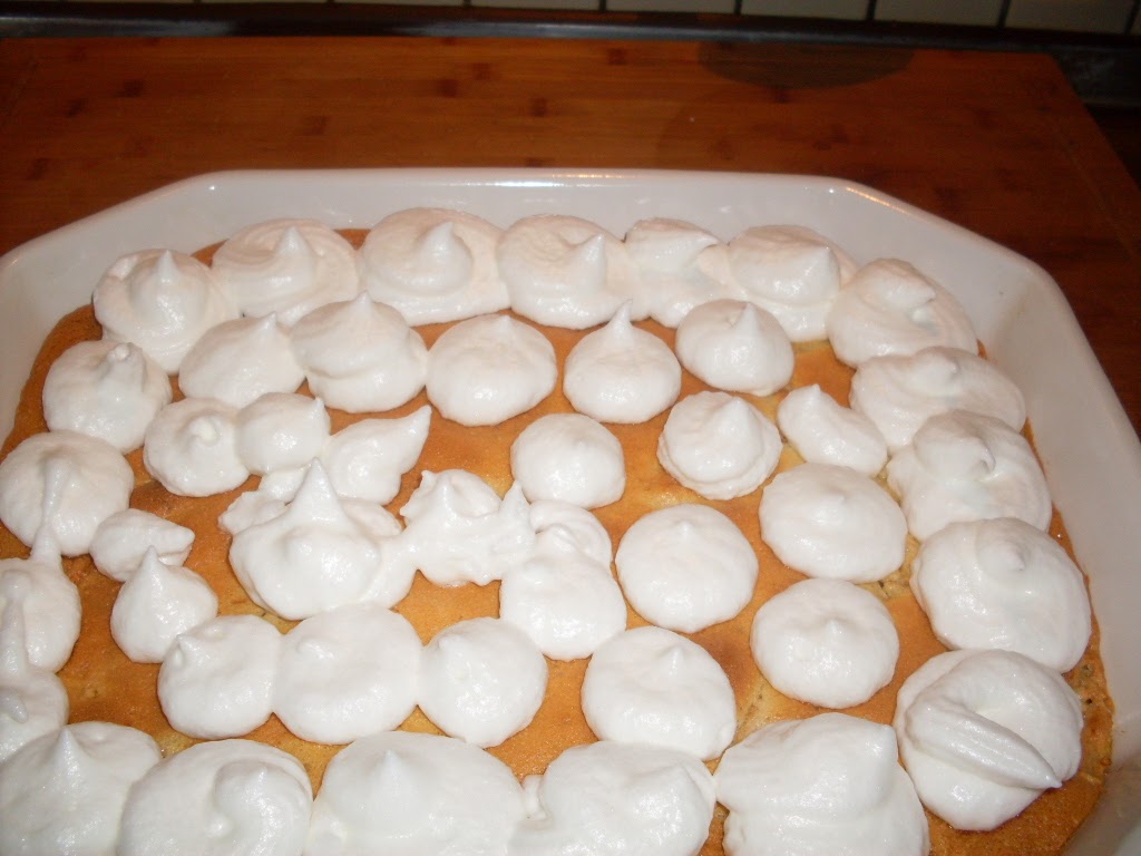 Когато сладкишът е готов, отгоре се добавят белтъците. Аз опитах със шприц, за да стане по-интересно, но не си разпределих правилно количеството белтъци. По принцип е достатъчно само да се изсипят и подравнят.