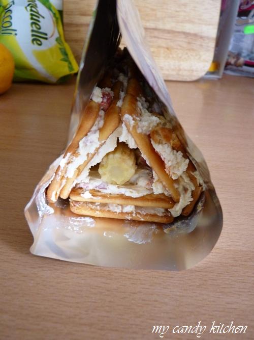 Върху алуминиево фолио подредете 1 пласт от 24 бисквити / 3 бр * 8 бр./ Може предварително да ги потопите за кратко в прясно мляко, но ще станат много меки и ще работите трудно.