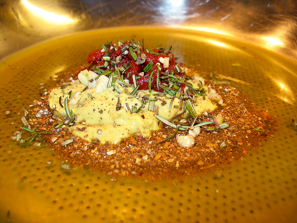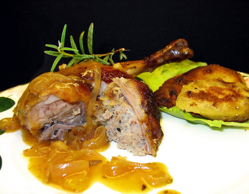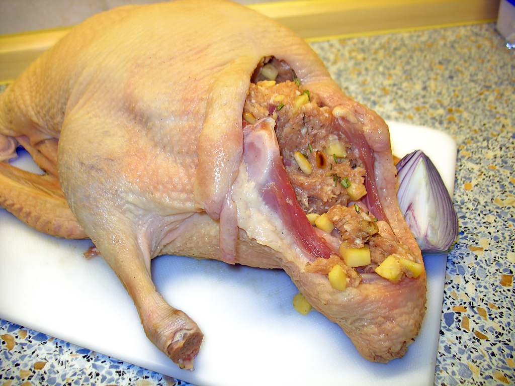 3. За да не си създадем стрес и не изпаднем малко преди финала в паника, започваме операцията на пернатото поне 3,5 часа преди презентацията. Тук също препичаме кедровите ядки и игличките розмарин, но само до толкова, колкото да им вдъхнем от аромата. Прибавяме ги към каймичка, омесена с горепосочените продукти и натъпкваме после добре разкраченото пате с нея.