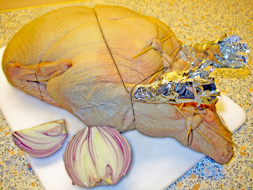 1. Правим първо на патката последната баня като я измиваме добре, а после много старателно я подсушаваме като бебенце с кърпа. Поръсваме я обилно отвън и отвътре с байц-а, поставяме я в торбичка за два дни в хладилника като я обръщаме от време на време за да не ни се разсърди.