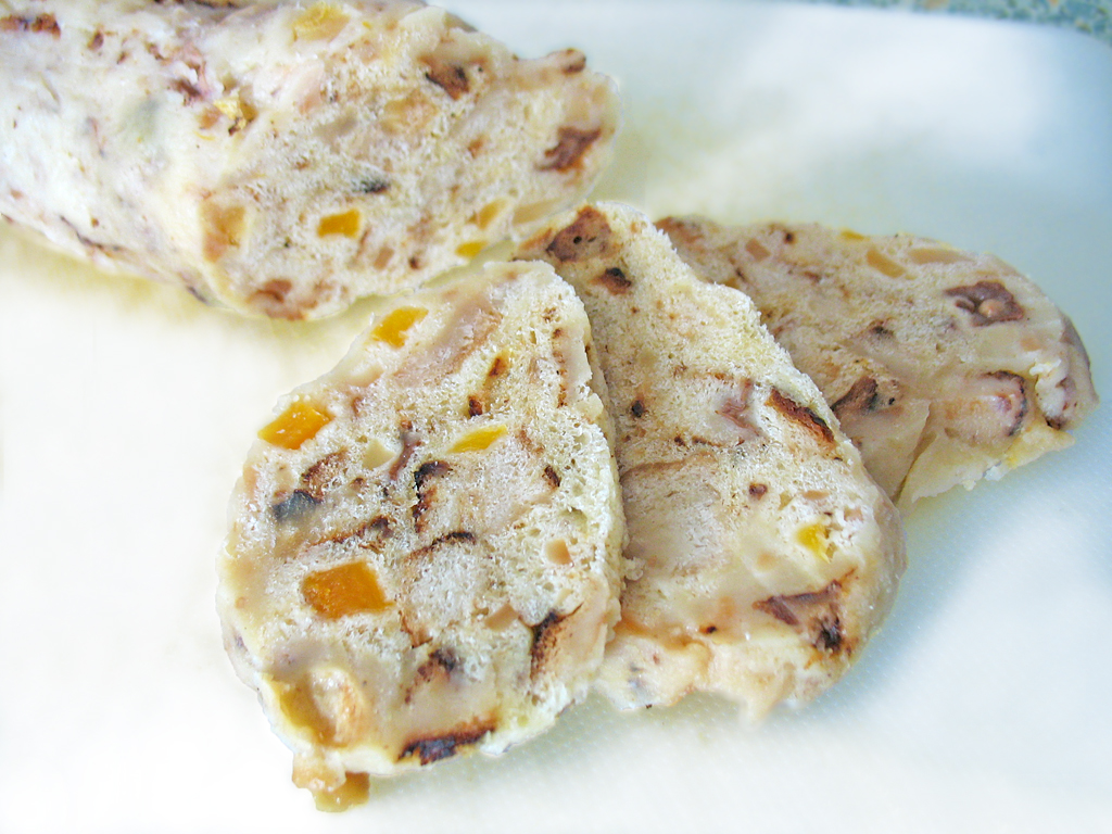 За целта препичаме леко бадемите без мазнина и за кратко в тиганче, нарязваме на ситно кайсиите и запържваме в 60г краве масло нарязания на зарчета хляб със стафиди.
