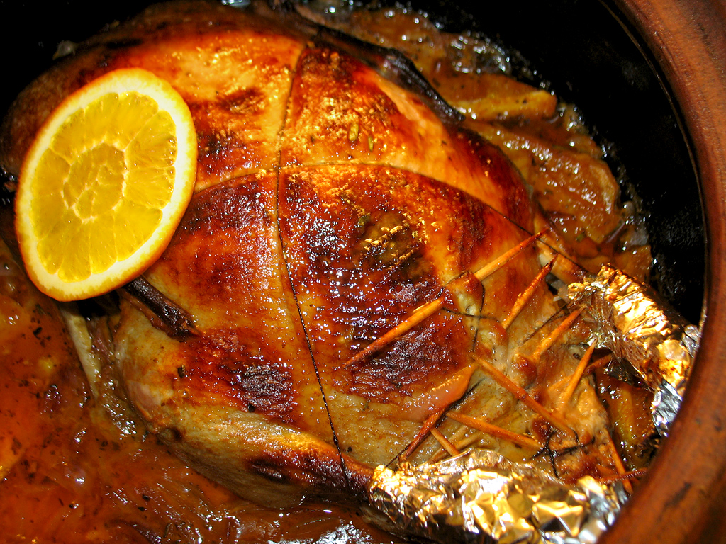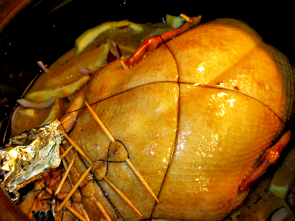 5. След един час изсипваме отделената при печенето мазнина, добавяме при патето цялата точка 4, а него самото намазваме обилно с добре подлютения с кайенски пипер мед и го бутаме обратно във фурната след като сме прибавили преди това и бульона.
