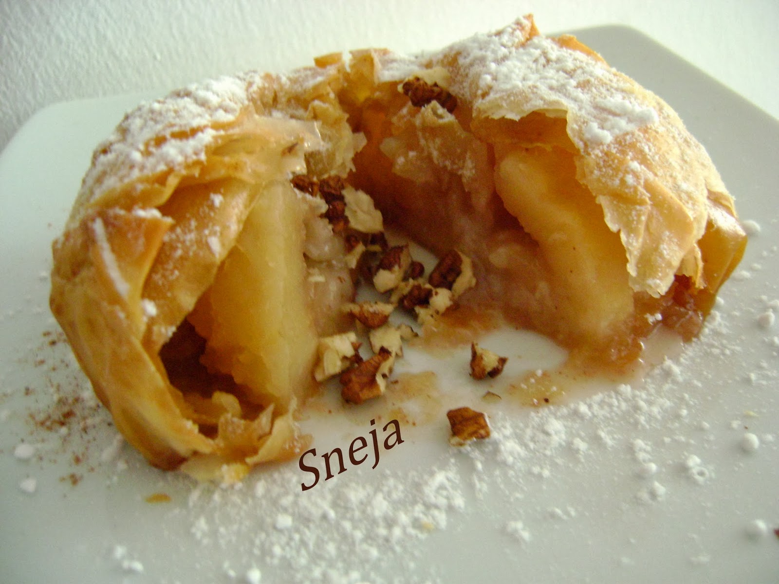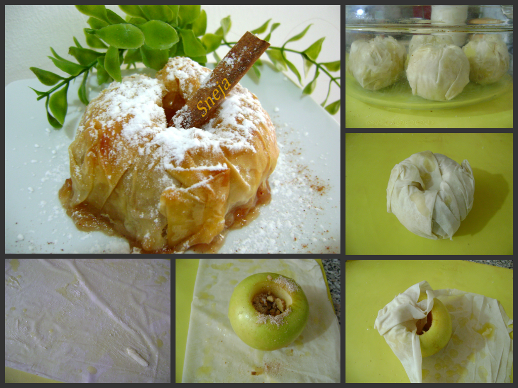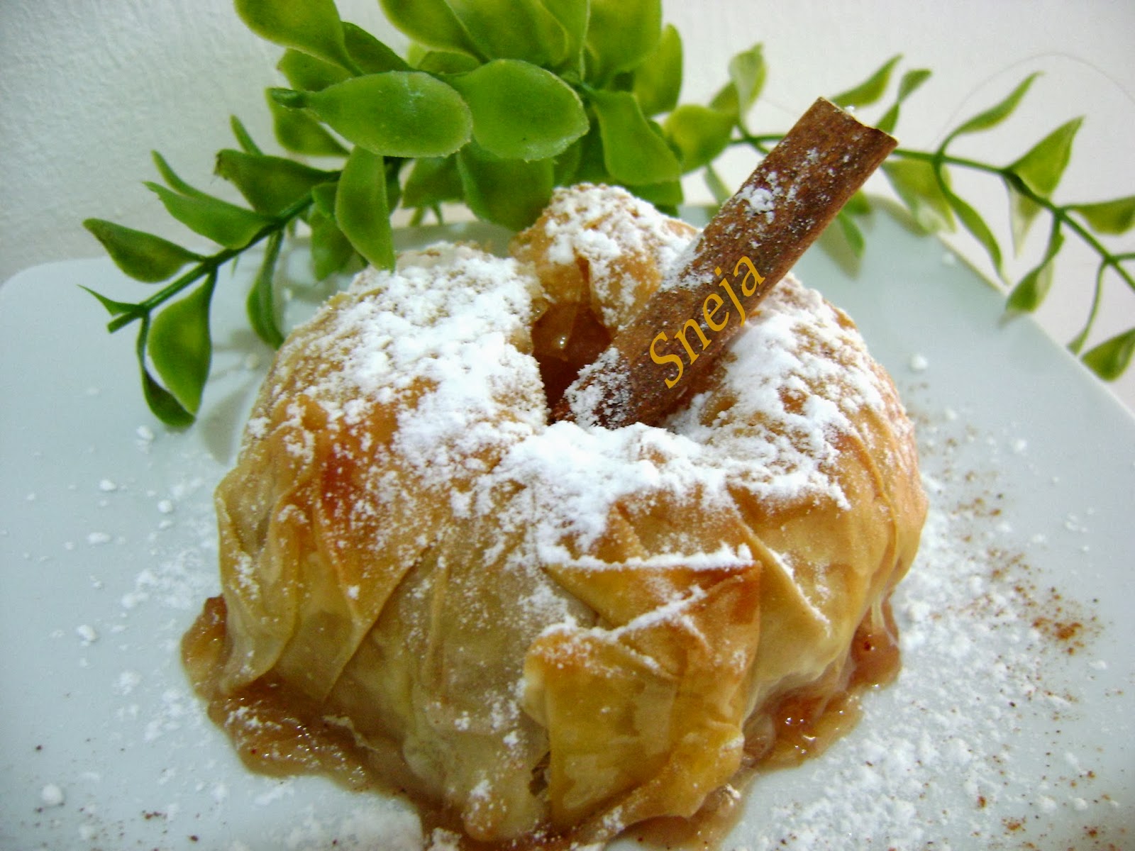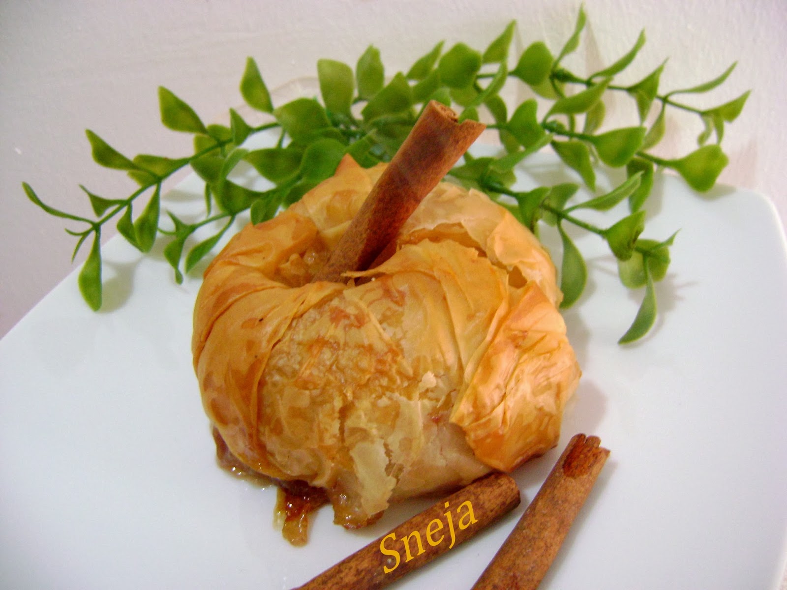 Печени ябълки съм правила много пъти,но сега реших да пробвам като ги обвия с листи за баница.Получиха се страхотни.Листите станаха хрупкави с вкус на масълце,а самите ябълки запазиха формата си и са много вкусни с аромат на канела.В този вариант са идеално предложение за десерт когато имаме гости,за някакъв празник или за ежедневната ни трапеза.